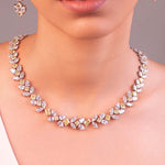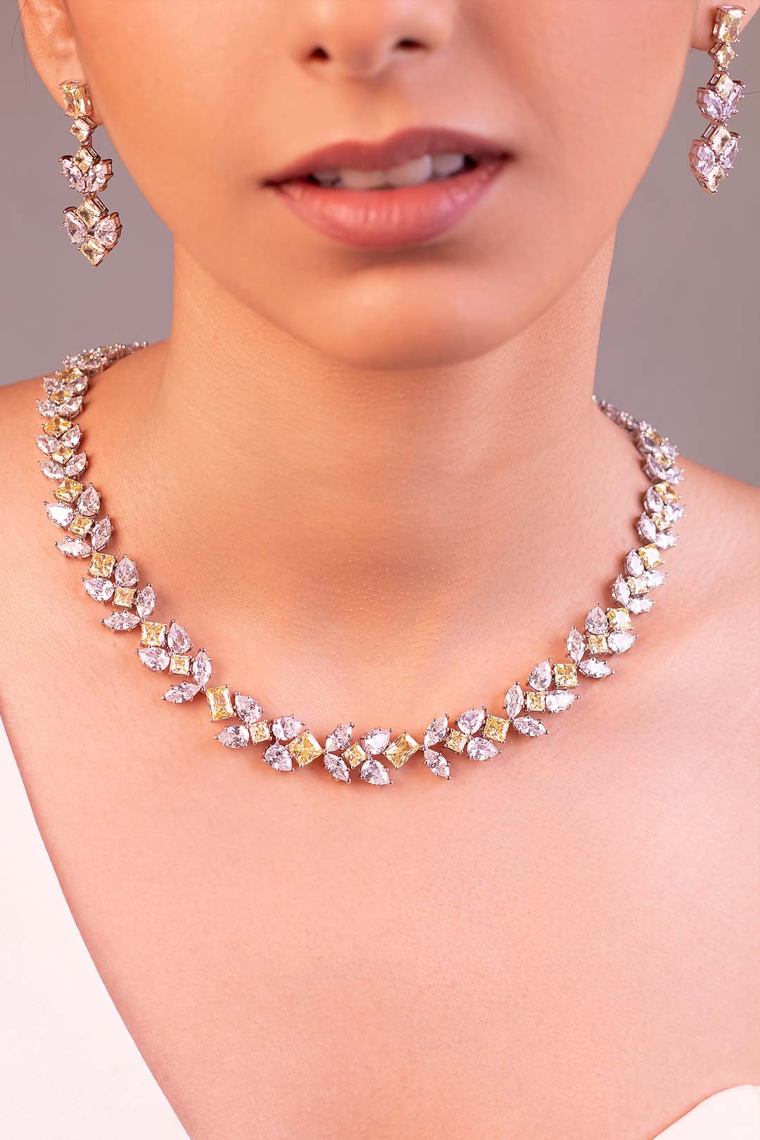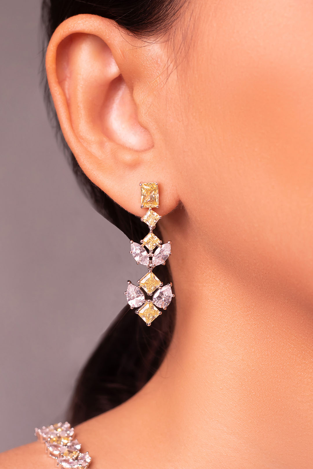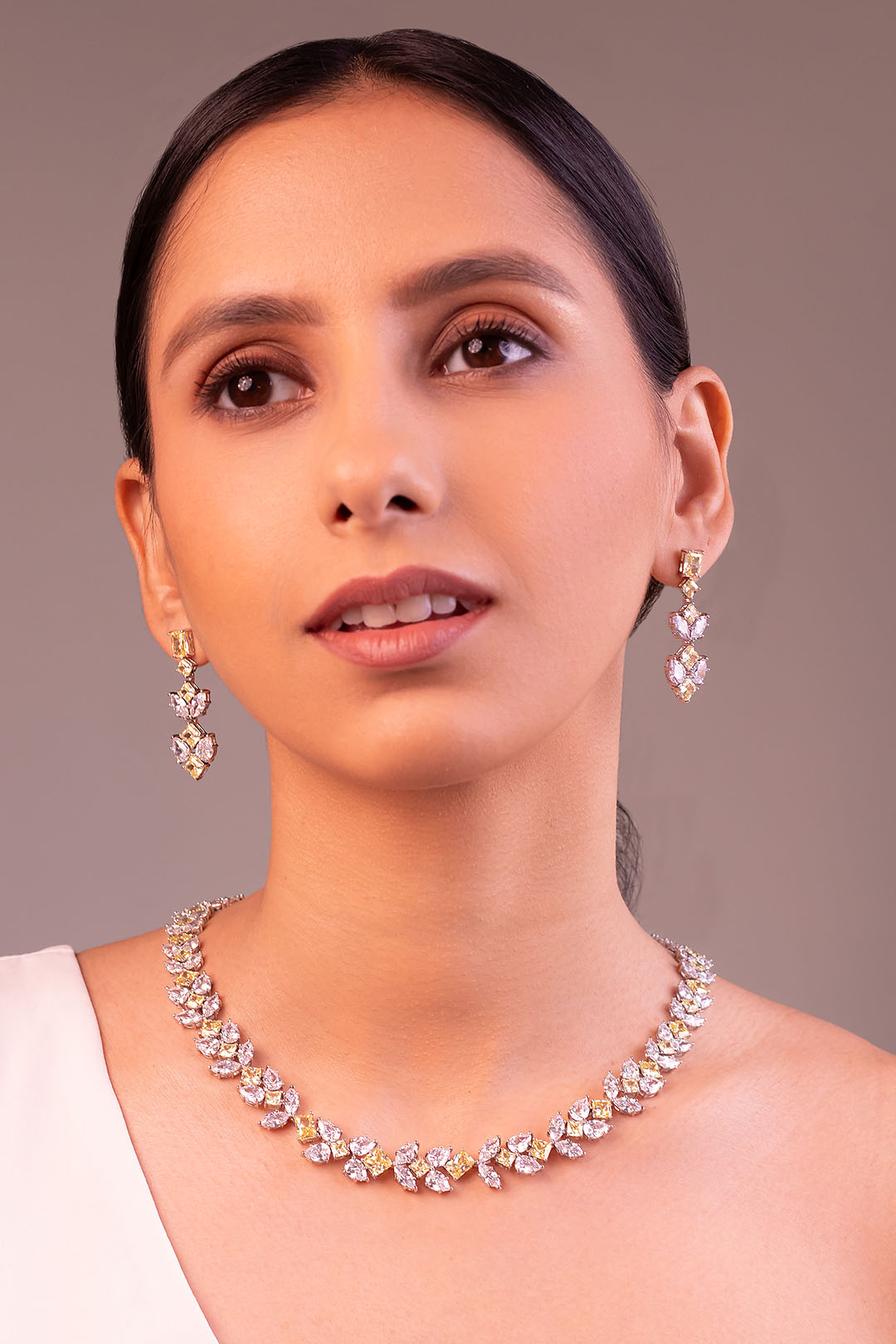يتميز التصميم ببلورات صفراء زاهية على شكل دمعة، مزينة بأحجار زركونيا مكعبة متلألئة، مرتبة بنمط عصري رقيق يضفي جمالاً على خط العنق. وتكتمل المجموعة بأقراط متناسقة بتصميم متدلي ناعم وأنيق.