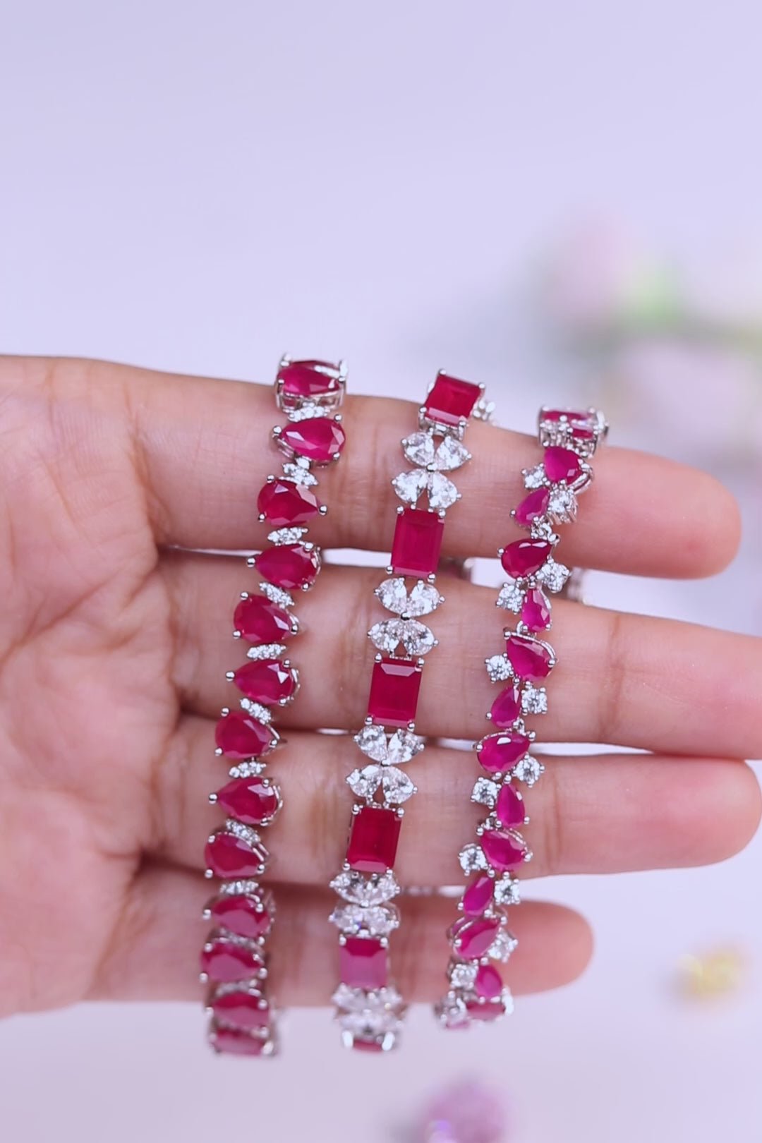 This bracelet features pear-cut ruby-hued stones framed by delicate CZ detailing. Each stone is meticulously set to create a fluid line of colour and sparkle that catches the light with every move.