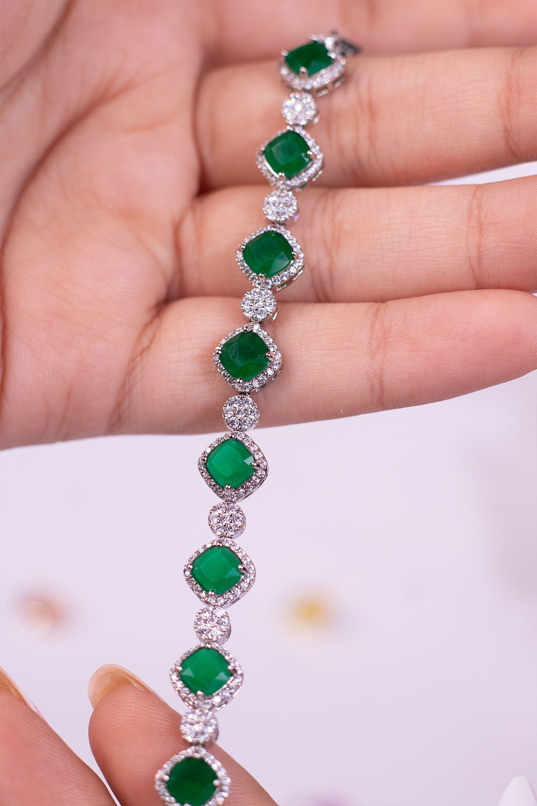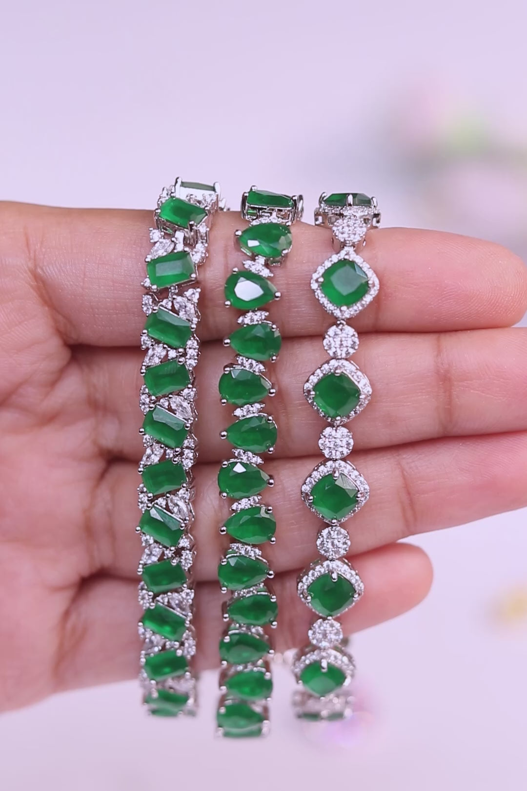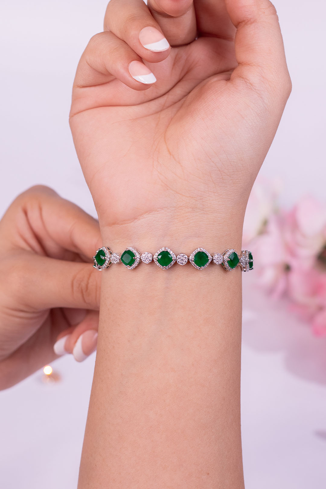 This bracelet brings a soft, feminine glow with its cushion-cut green crystals, each framed with delicate pavé detailing.