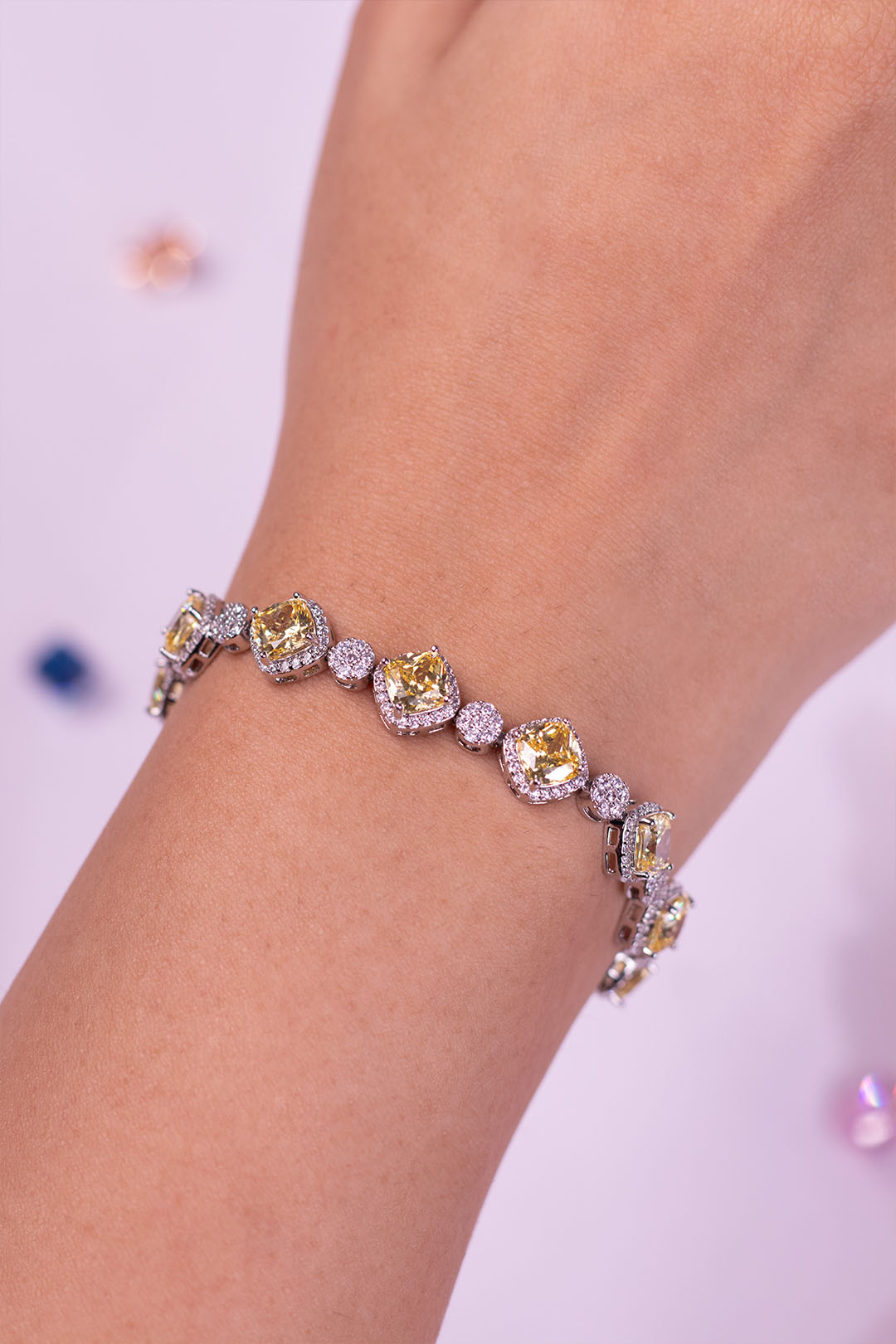 This bracelet brings a soft, feminine glow with its cushion-cut yellow crystals, each framed with delicate pavé detailing.