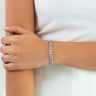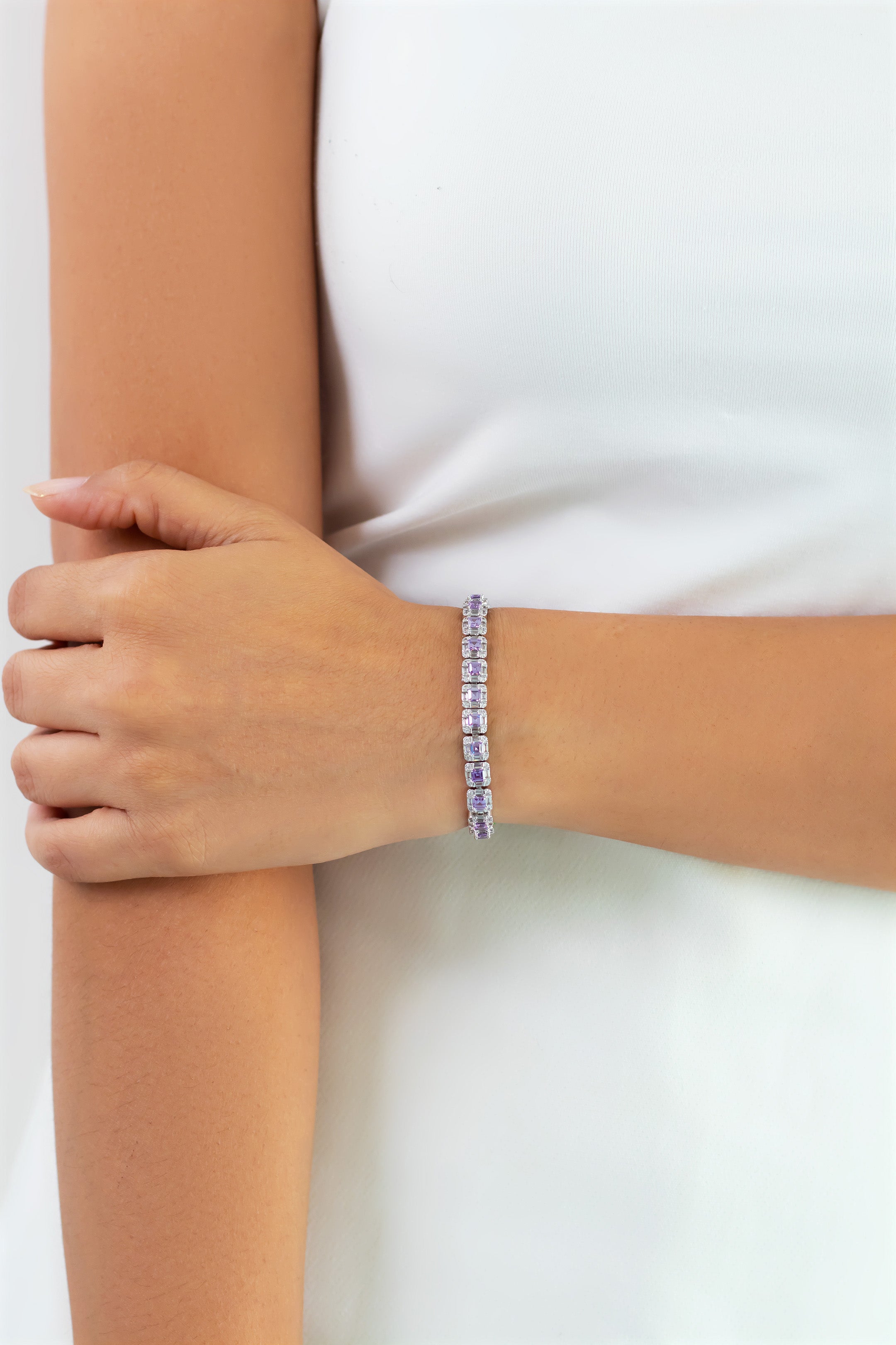 This bracelet showcases a refined row of lavender-hued stones, each cut with precision and haloed by glistening pavé detailing. The soft lilac tones exude understated elegance, while the rhodium-plated finish adds a contemporary edge.