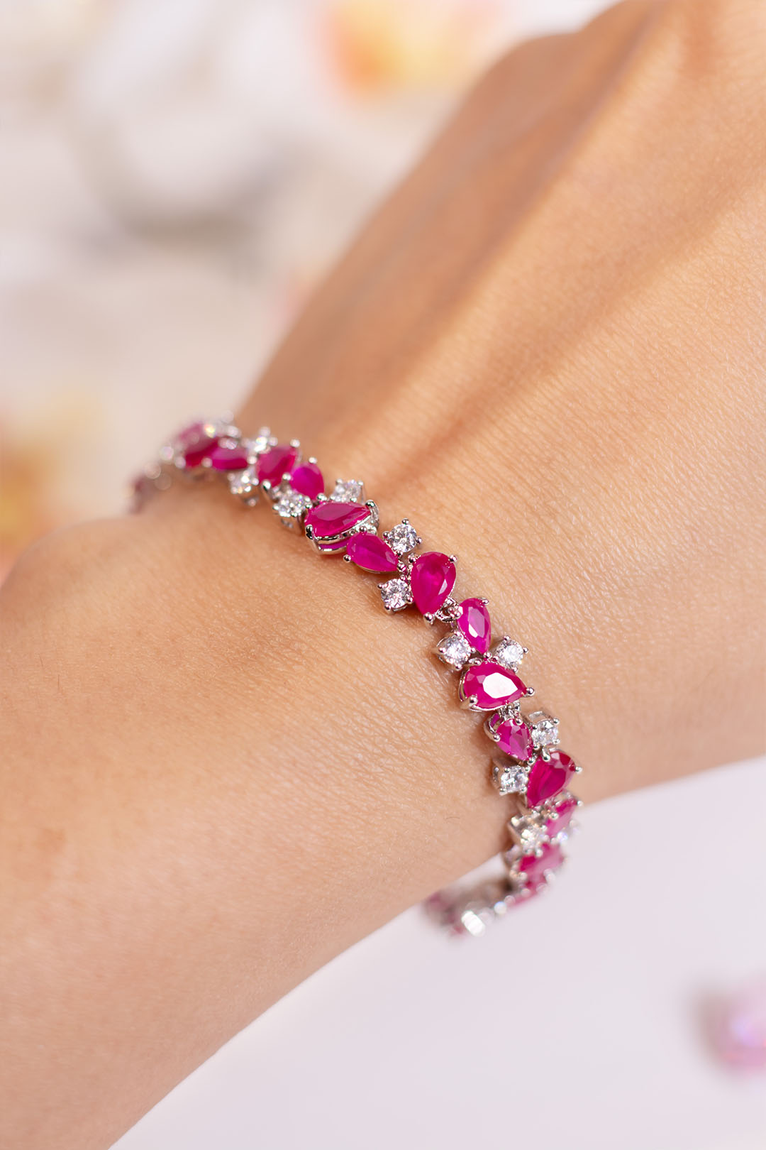 This bracelet brings a vibrant pop of colour to your wrist with its rich ruby-pink stones paired beautifully with sparkling CZ clusters.