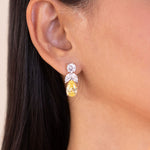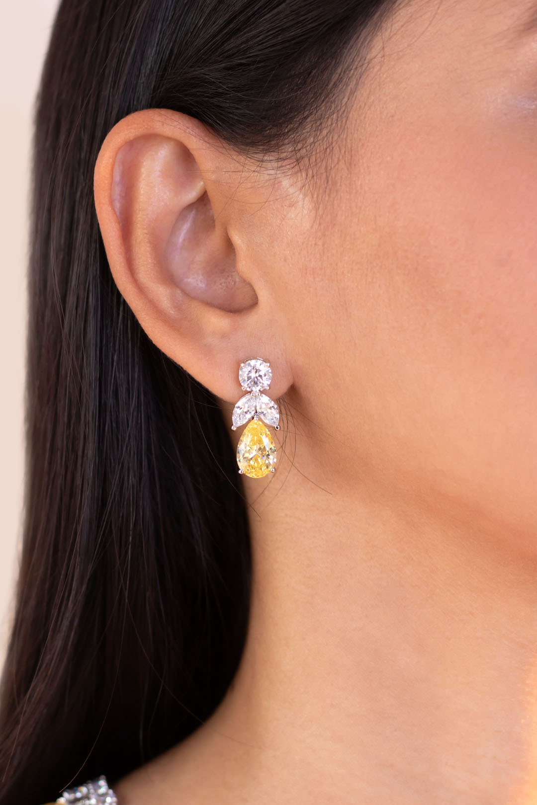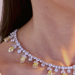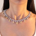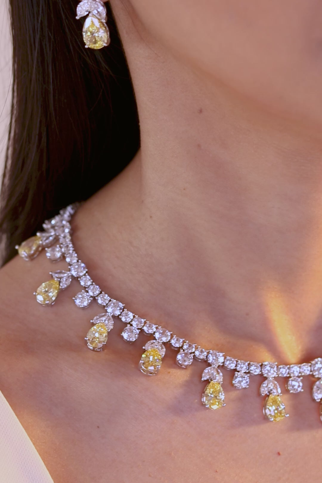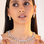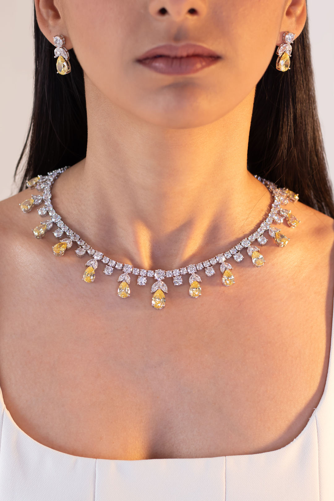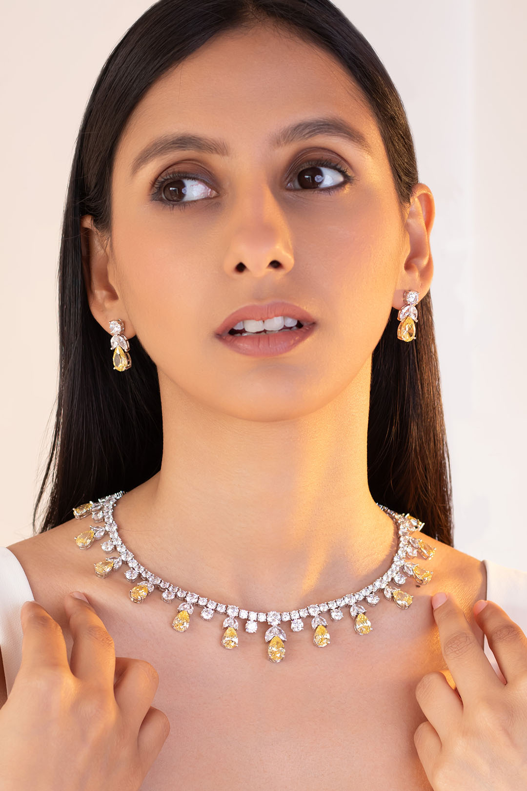 The design features bright yellow teardrop crystals paired with sparkling CZ stones, arranged in a delicate, modern pattern that sits beautifully on the neckline. The matching earrings complete the set with a soft, graceful drop.