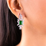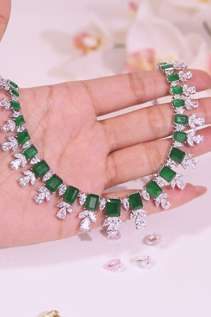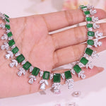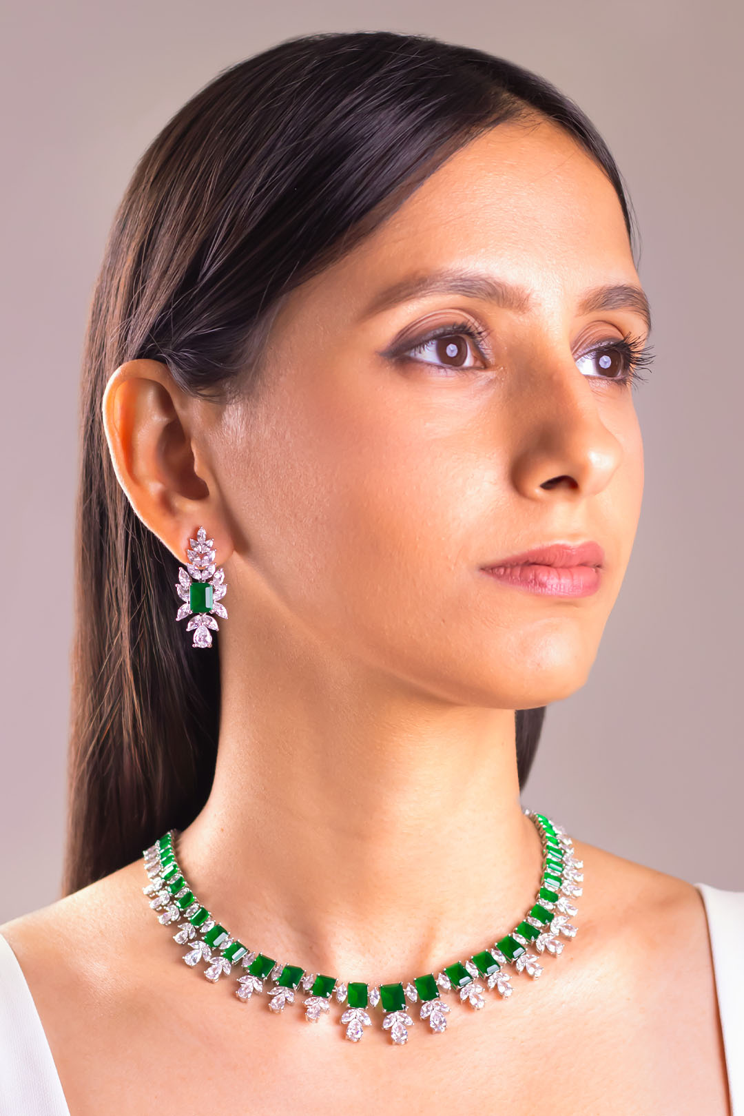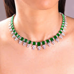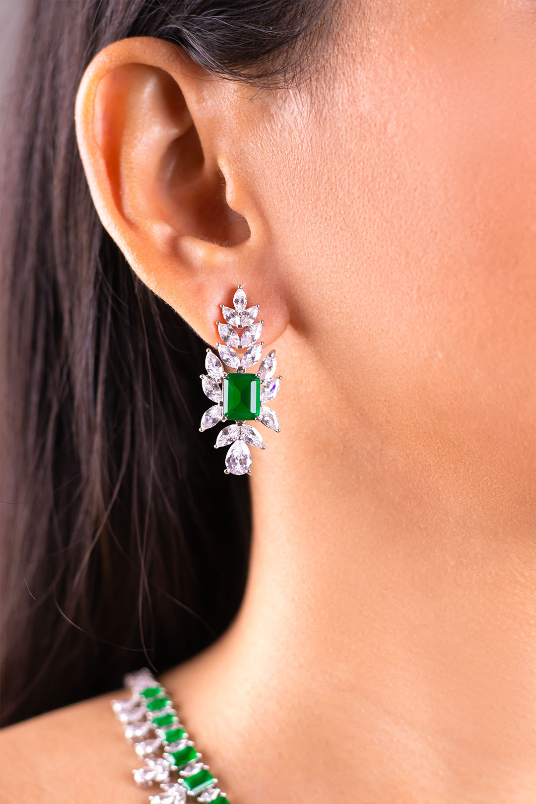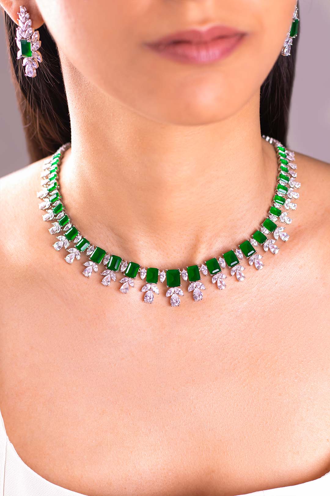 The deep green rectangular emerald cut stones create a striking, structured look, softened beautifully by sparkling CZ teardrops that add movement and shine. The matching earrings tie the set together with the same luxe balance of bold colour and delicate sparkle.