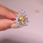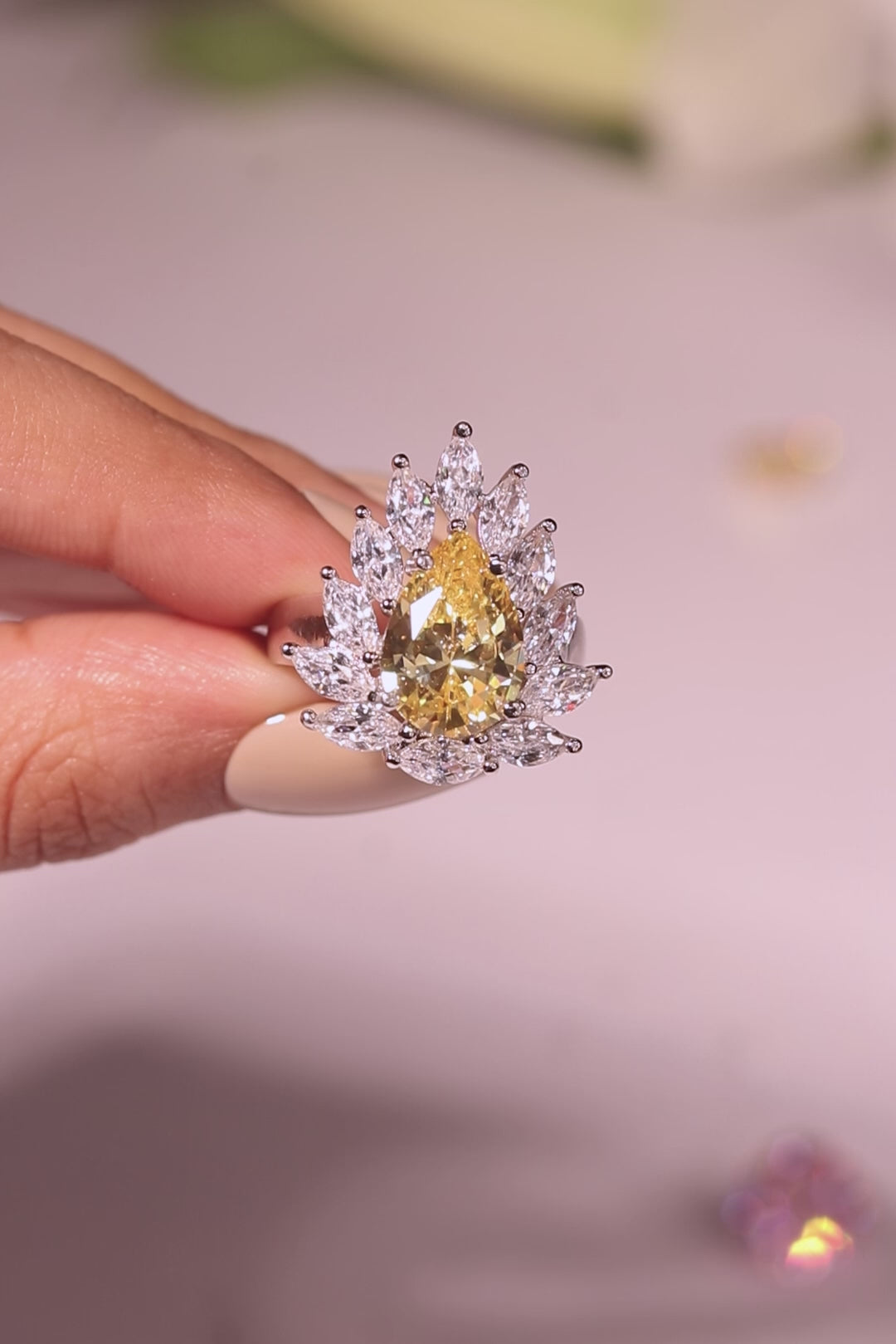 A radiant pear-cut yellow stone takes center stage, surrounded by an intricate halo of marquise-cut crystals arranged like a blooming coronet, this ring is set on a sleek adjustable rhodium-plated band.