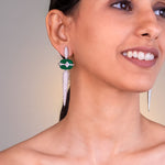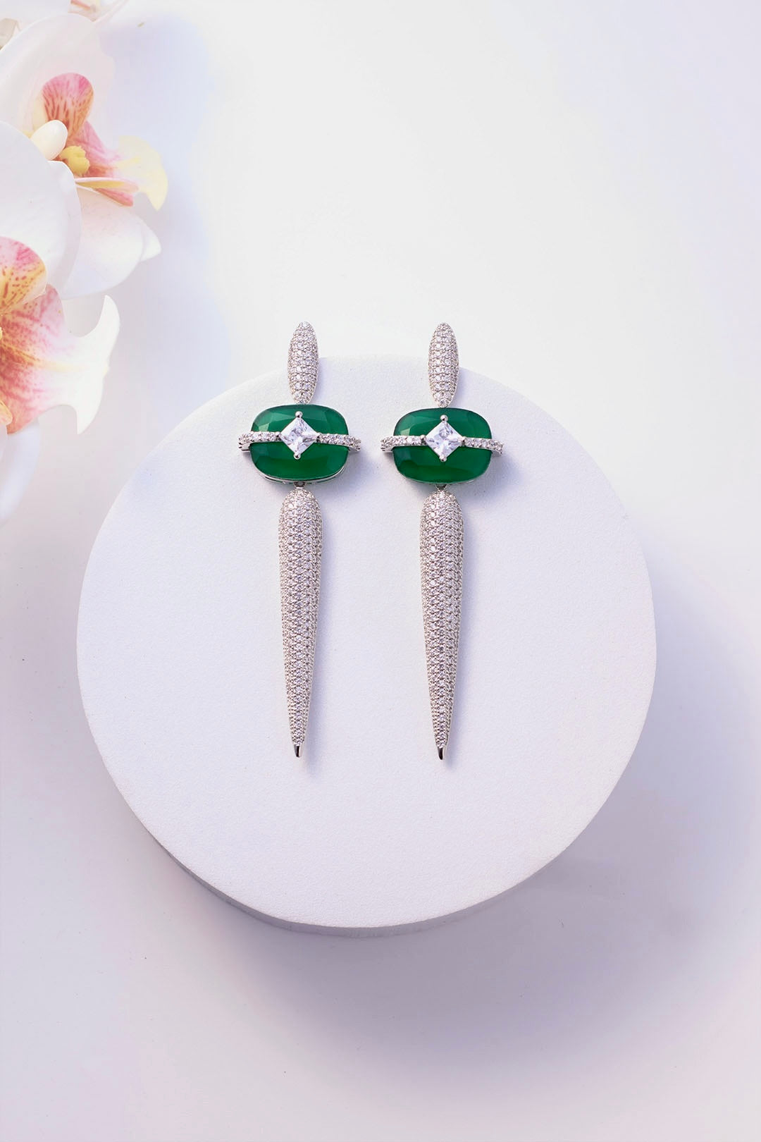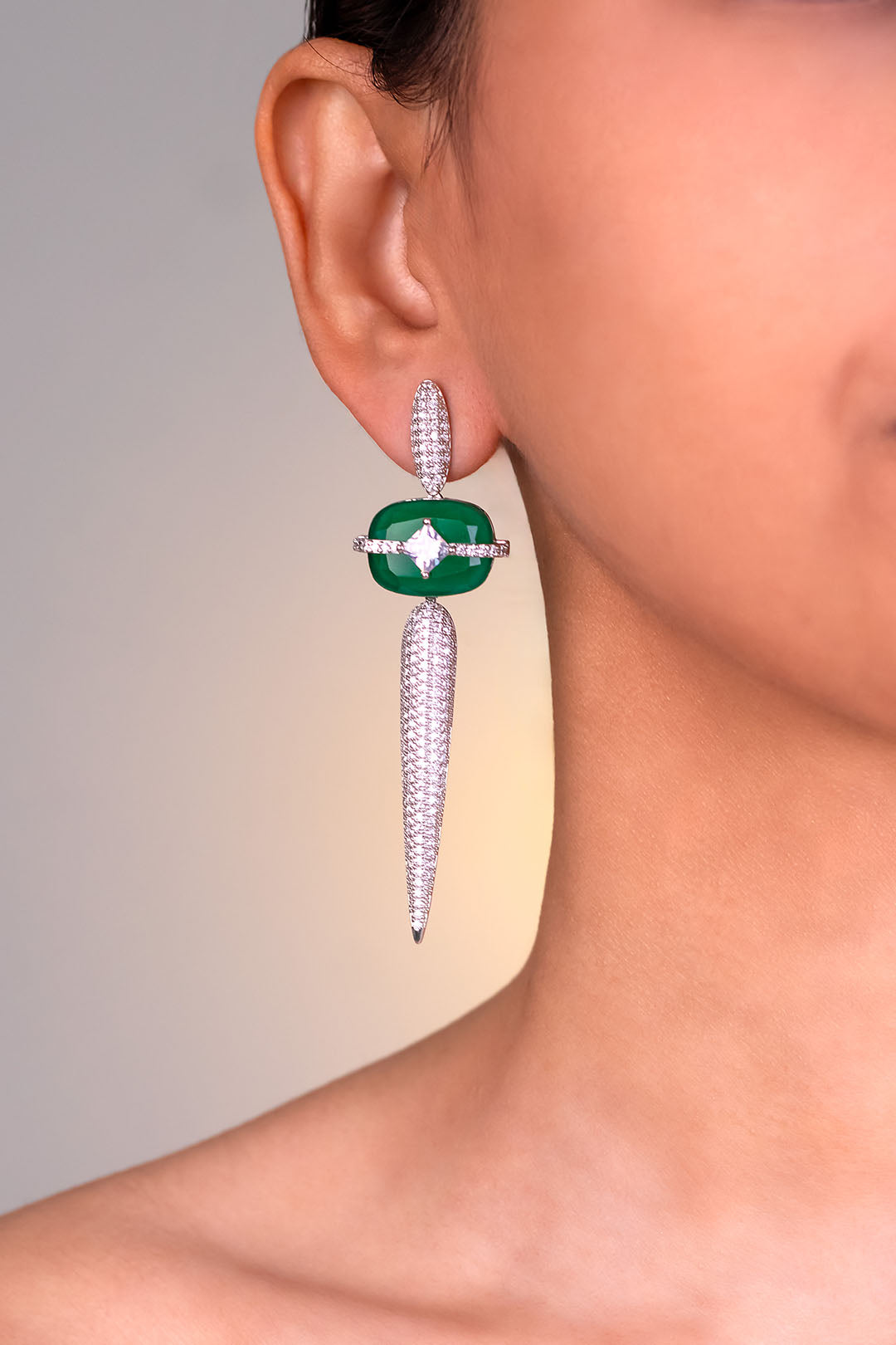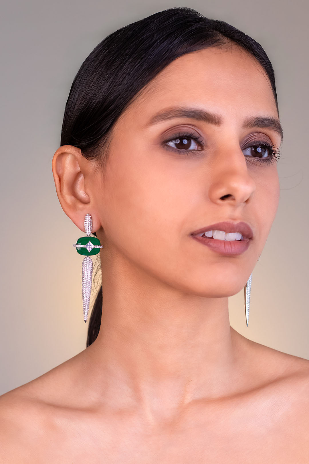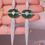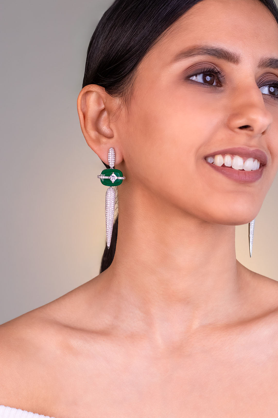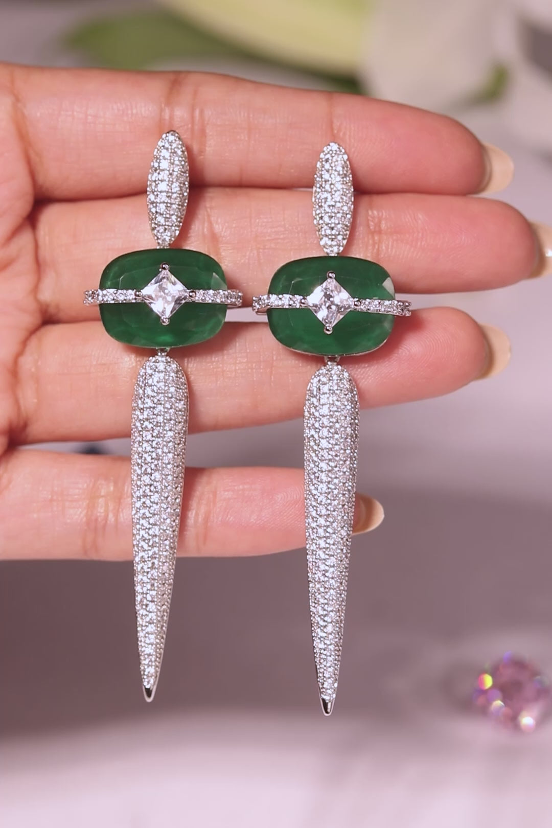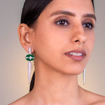 A bold interplay of emerald and shimmering pavé crystals, these earrings redefine modern elegance. The elongated silhouette adds effortless drama, while the emerald-toned centerpiece brings a touch of regal allure.