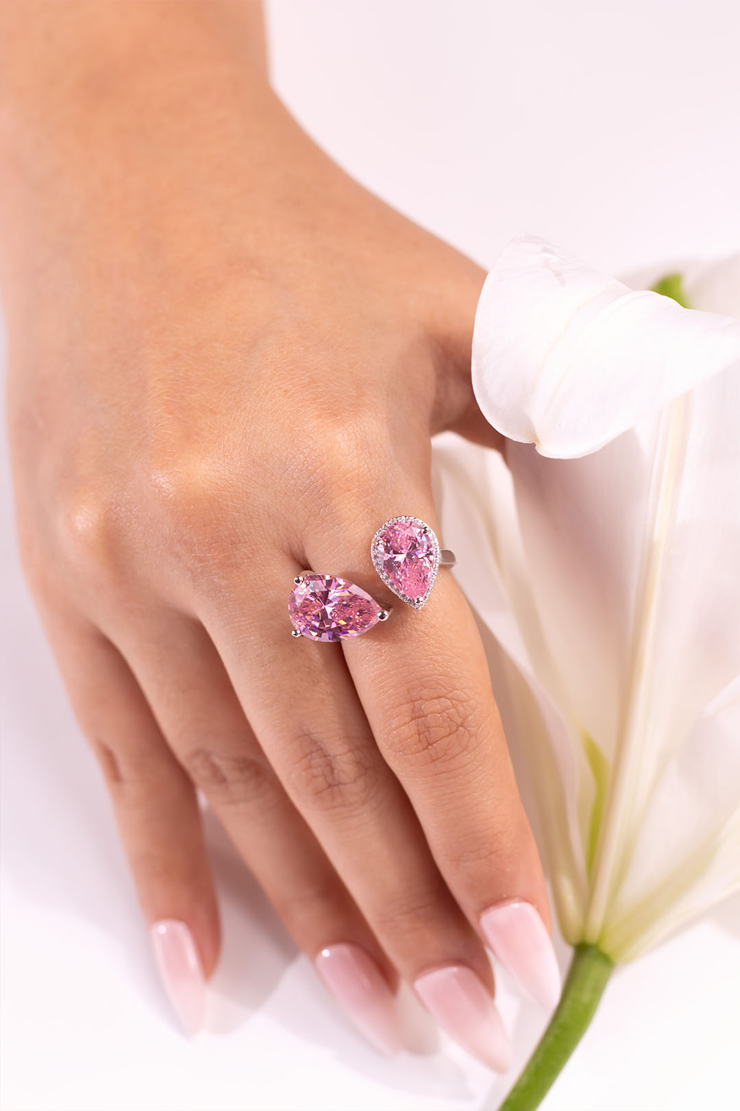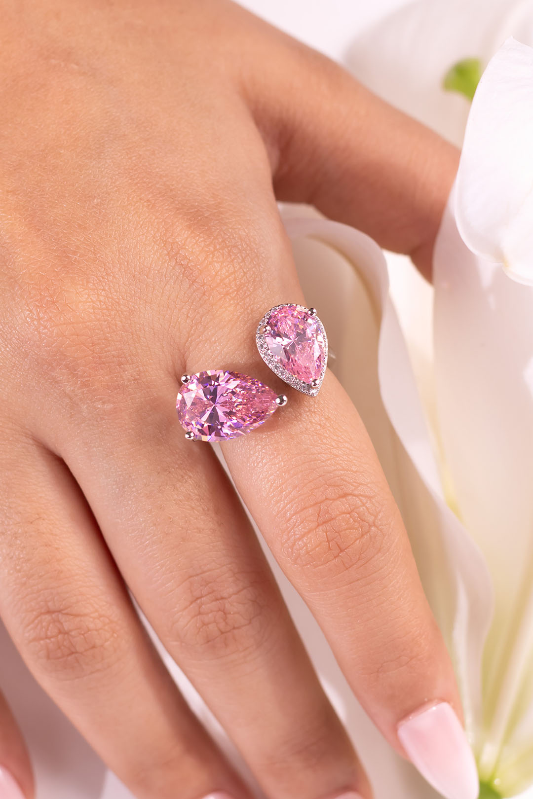 This ring combines timeless elegance with modern versatility. Featuring two captivating pear-shaped colored 5A CZ stones, delicately accented with pave details, this design exudes sophistication.