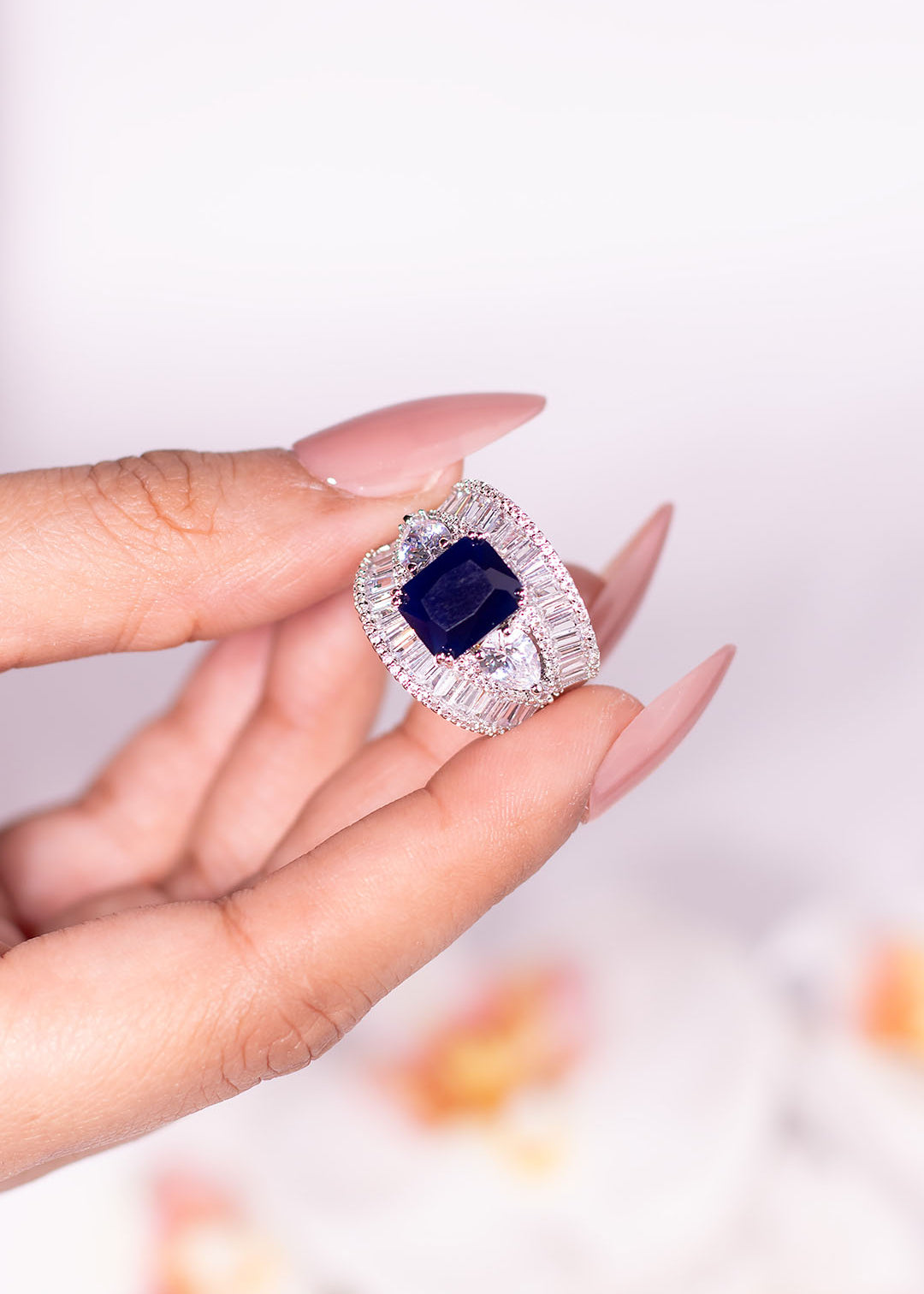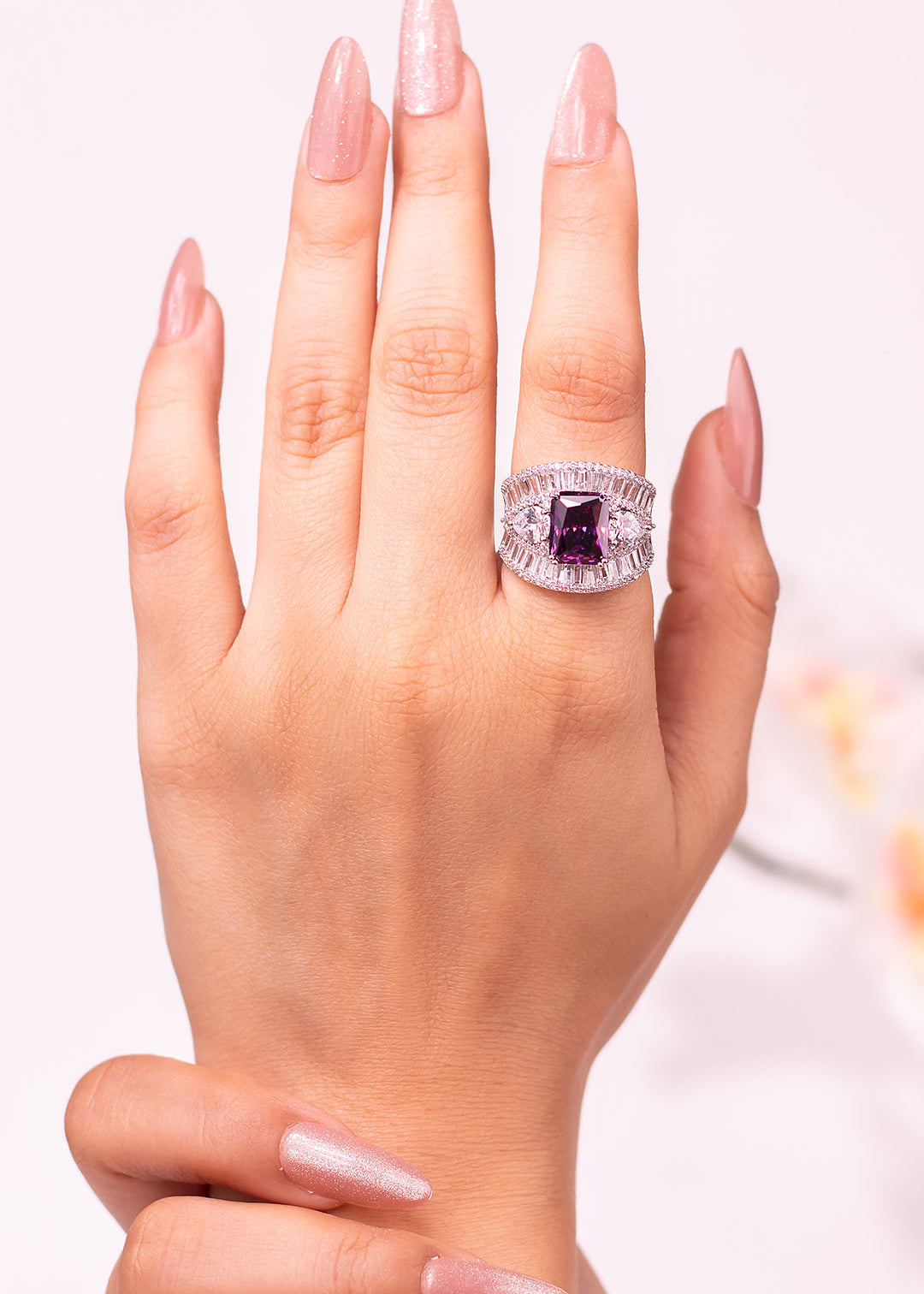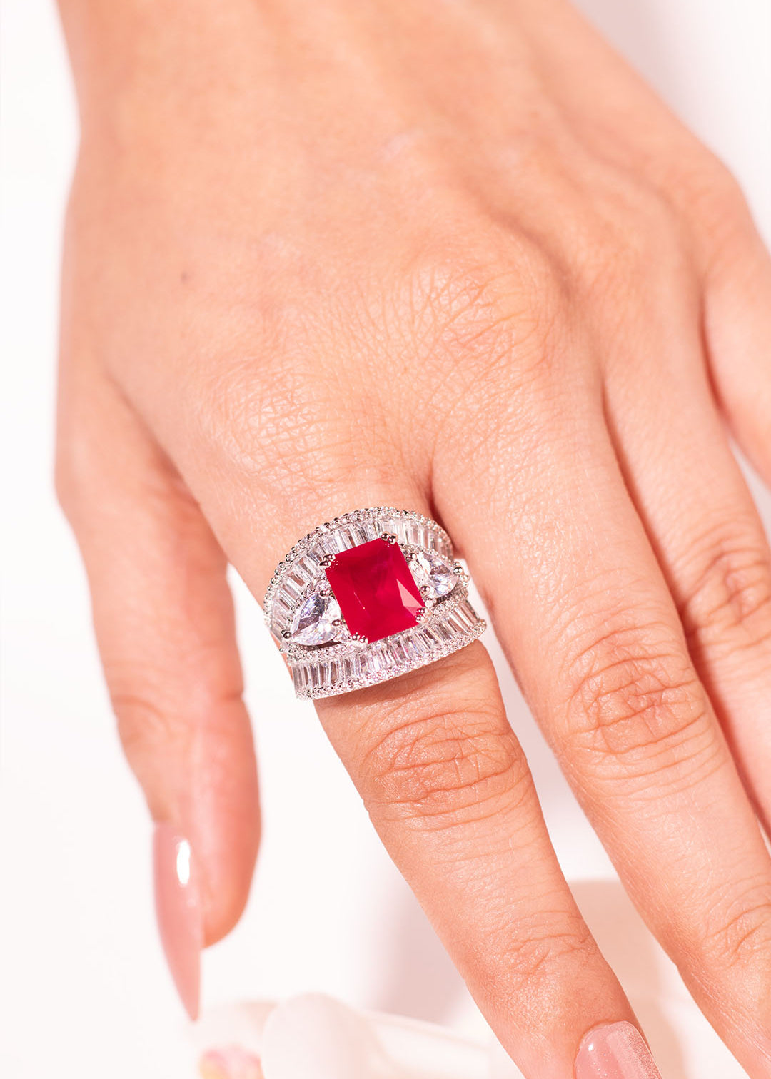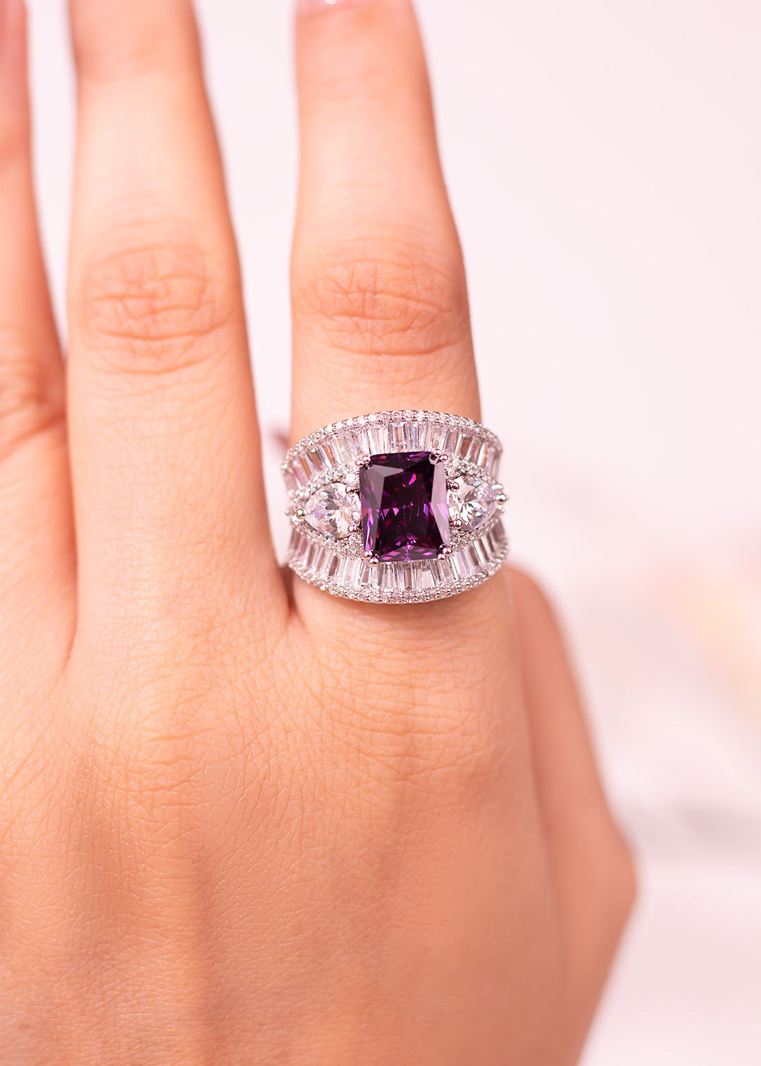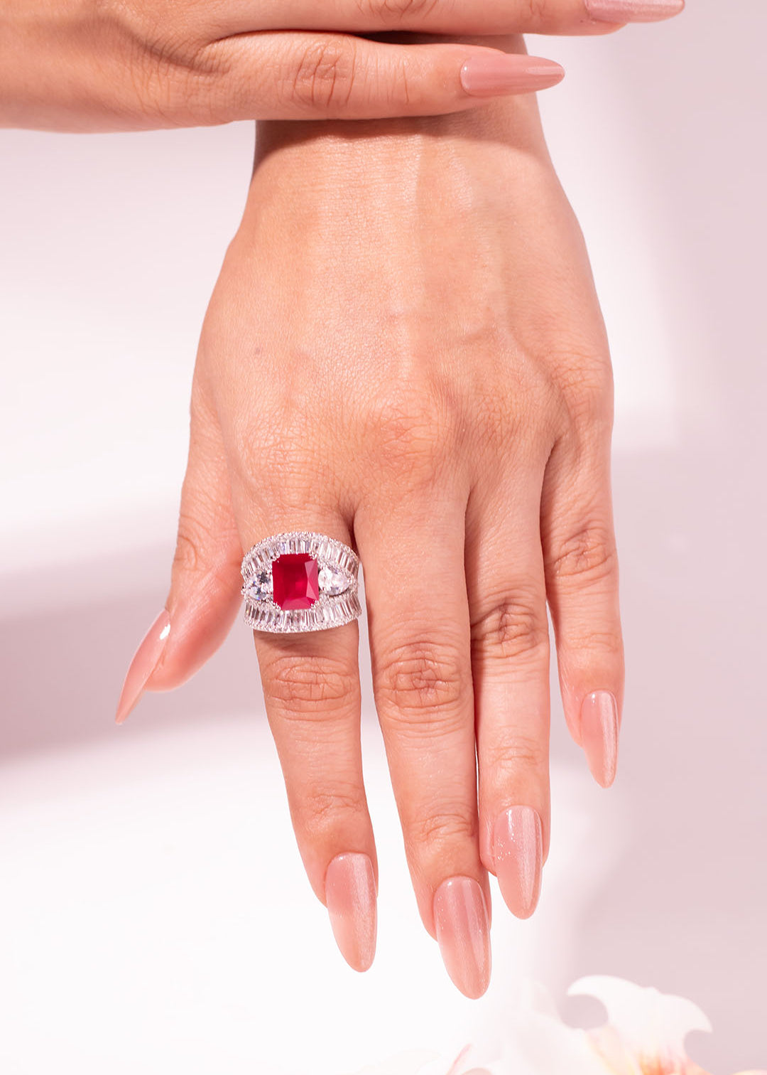 A captivating cushion-cut crystal set in a shimmering pavé band, this adjustable ring exudes elegance and romance. The soft blush hue radiates a timeless charm, making it a perfect statement of love and grace.