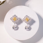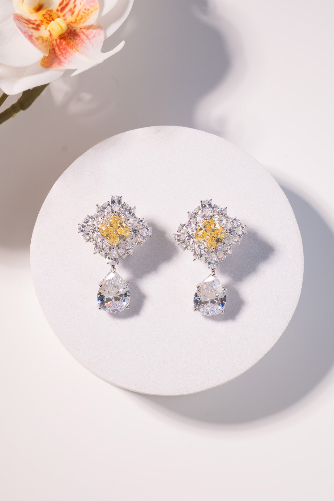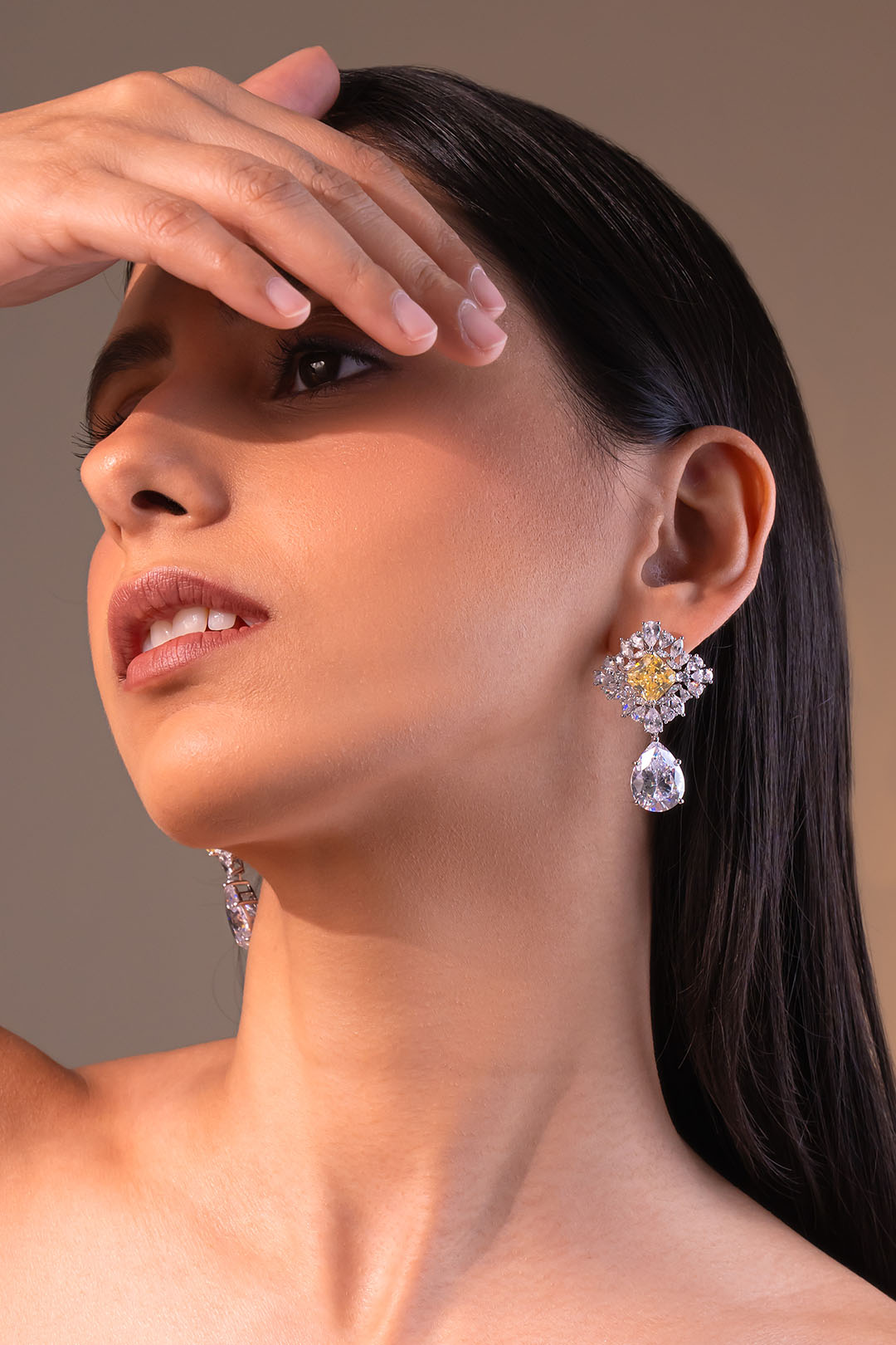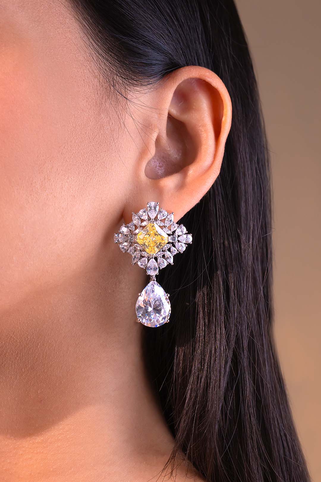 A bold statement earring featuring a yellow centre stone framed by a sparkling crystal halo, finished with a dramatic pear-cut drop. Designed to command attention, this piece is perfect for weddings, cocktail evenings, and grand festive occasions.