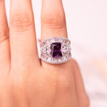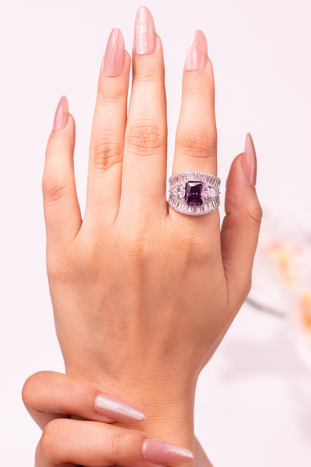 The Zafira Ring is all about bold elegance. A striking purple centre stone takes the spotlight, framed by sleek baguette-cut accents that add structure, sparkle, and a distinctly modern edge. The layered silhouette gives it a powerful, statement feel while still staying refined.
