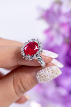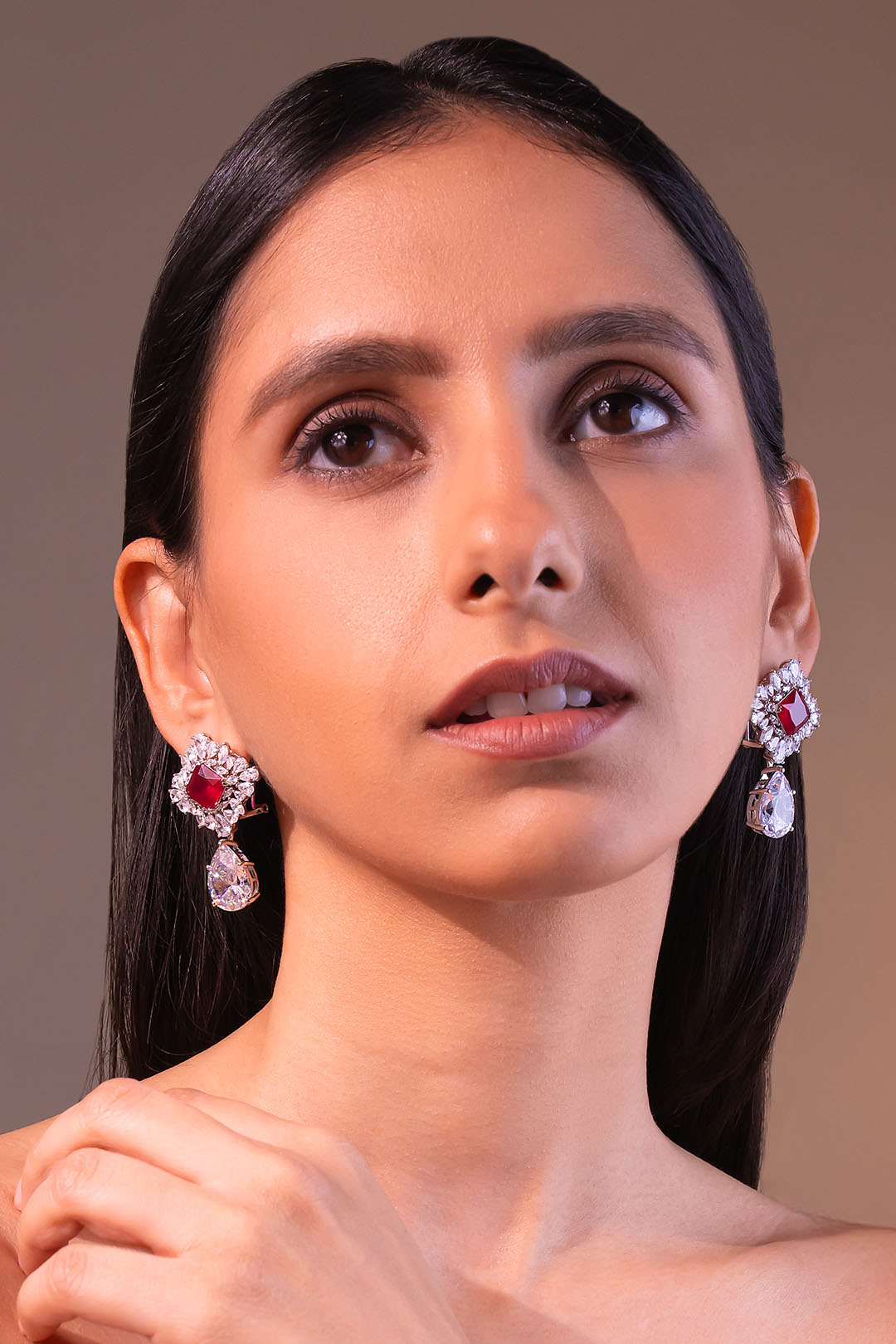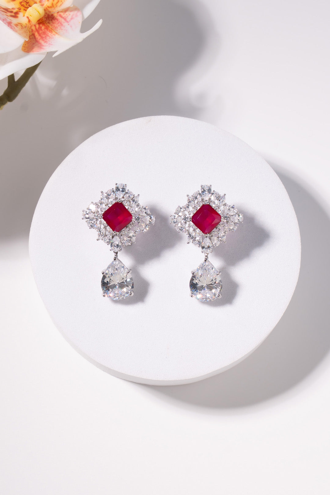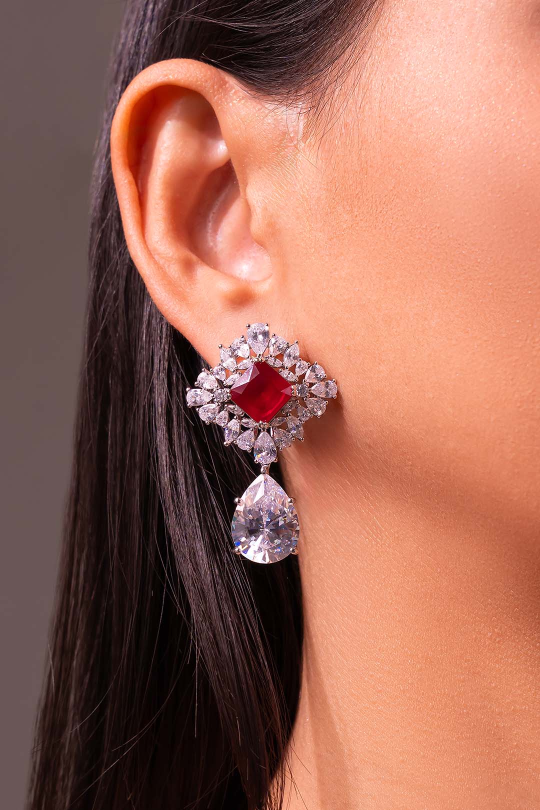A bold statement earring featuring a deep ruby centre stone framed by a sparkling crystal halo, finished with a dramatic pear-cut drop. Designed to command attention, this piece is perfect for weddings, cocktail evenings, and grand festive occasions.