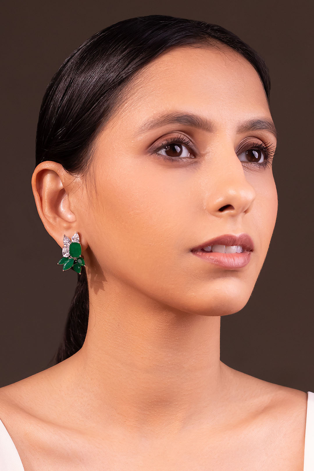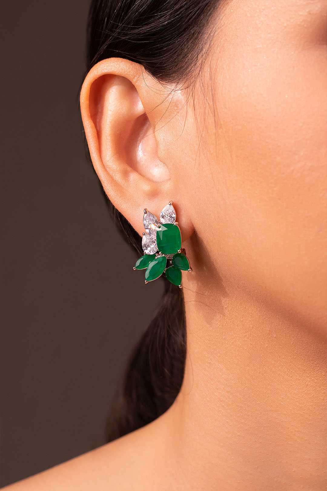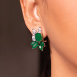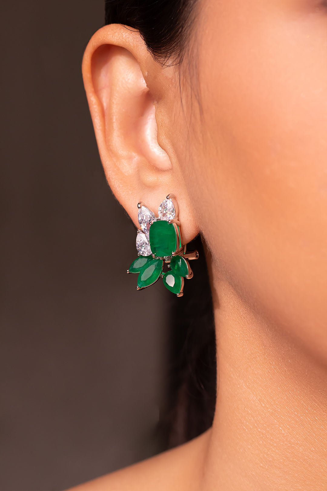 These abstract earrings made with a cluster of Emerald Green doublets creating a striking, luxe look that is balanced beautifully with white CZ petals.