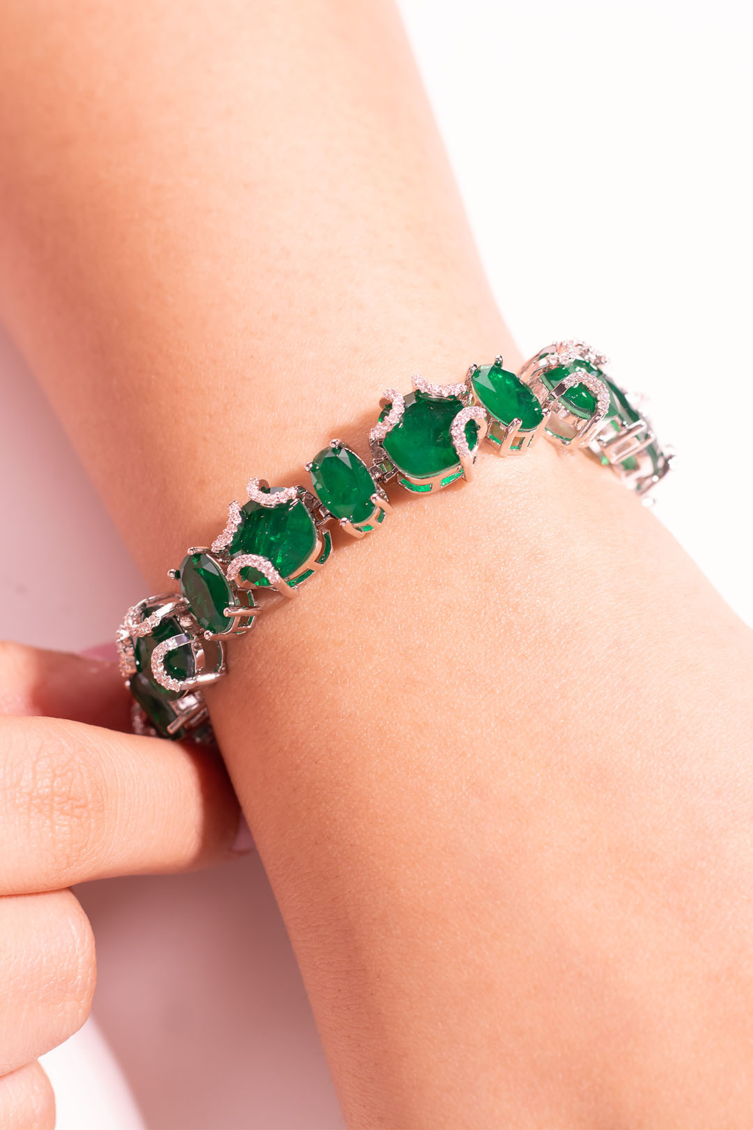 A refined row of emerald green stones framed with delicate crystal accents, this bracelet balances richness with restraint. Designed to sparkle with every movement, it’s a timeless addition to your occasion wardrobe.