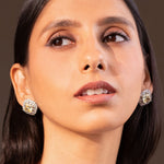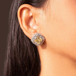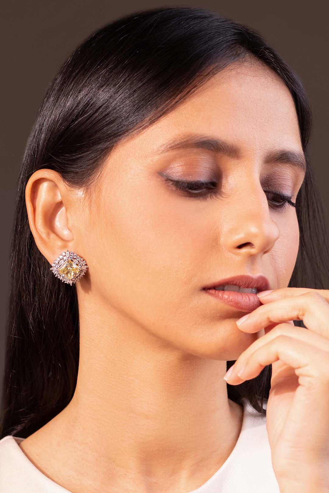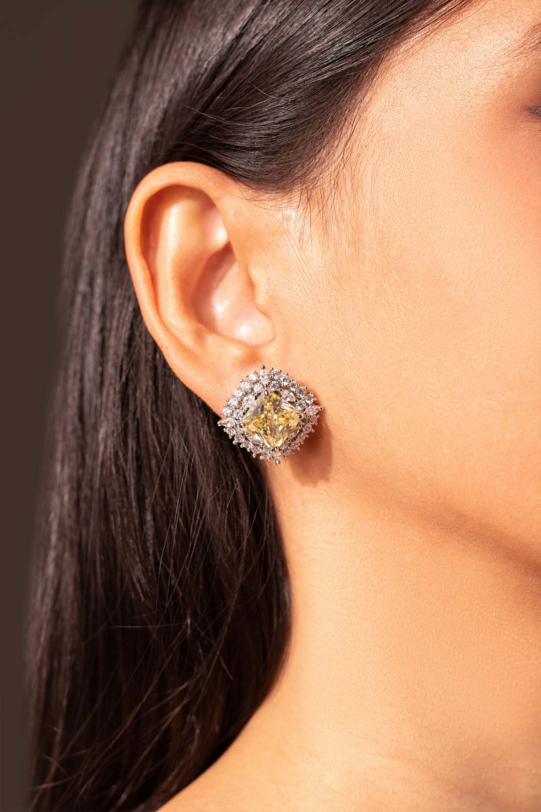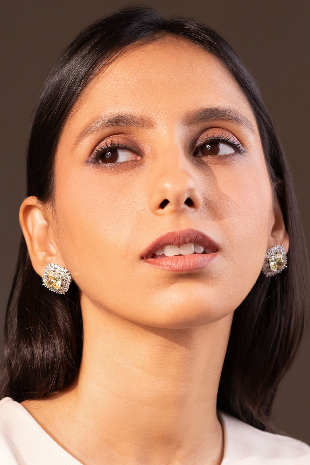 A refined statement stud featuring a soft yellow centre stone framed by a radiant crystal halo. Designed to balance elegance with impact, this piece adds a polished sparkle to festive looks, cocktail outfits, and evening wear.