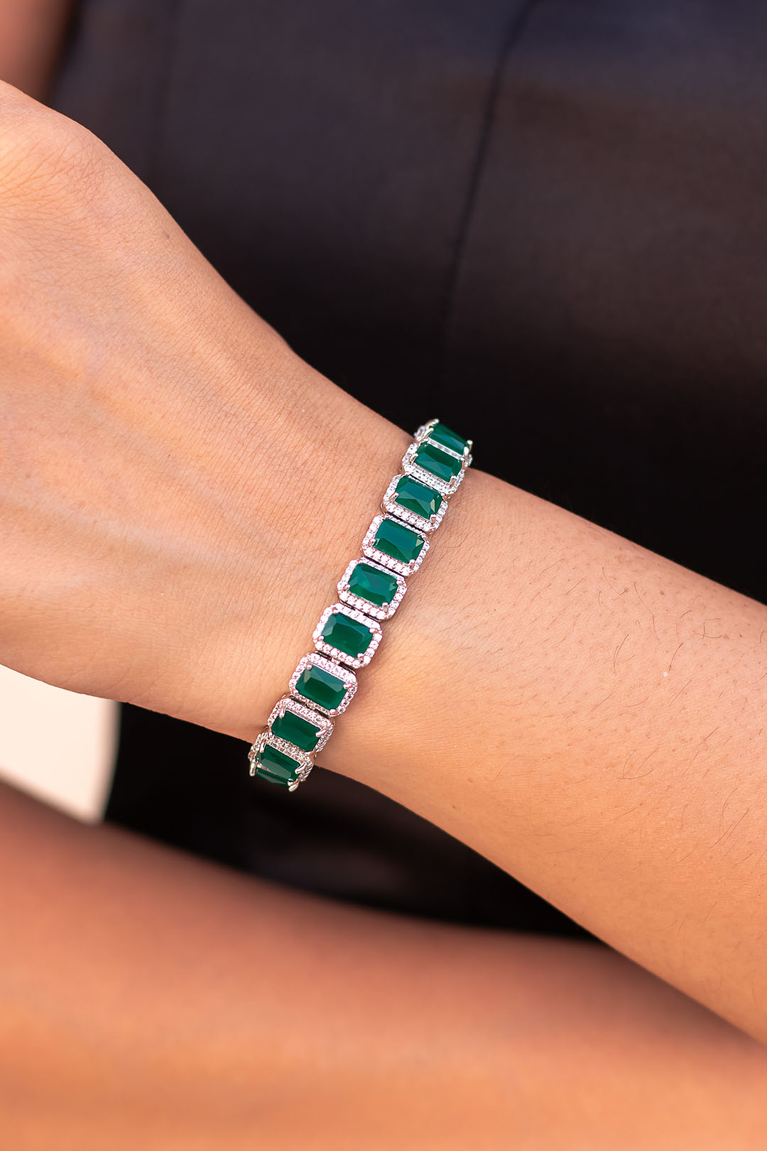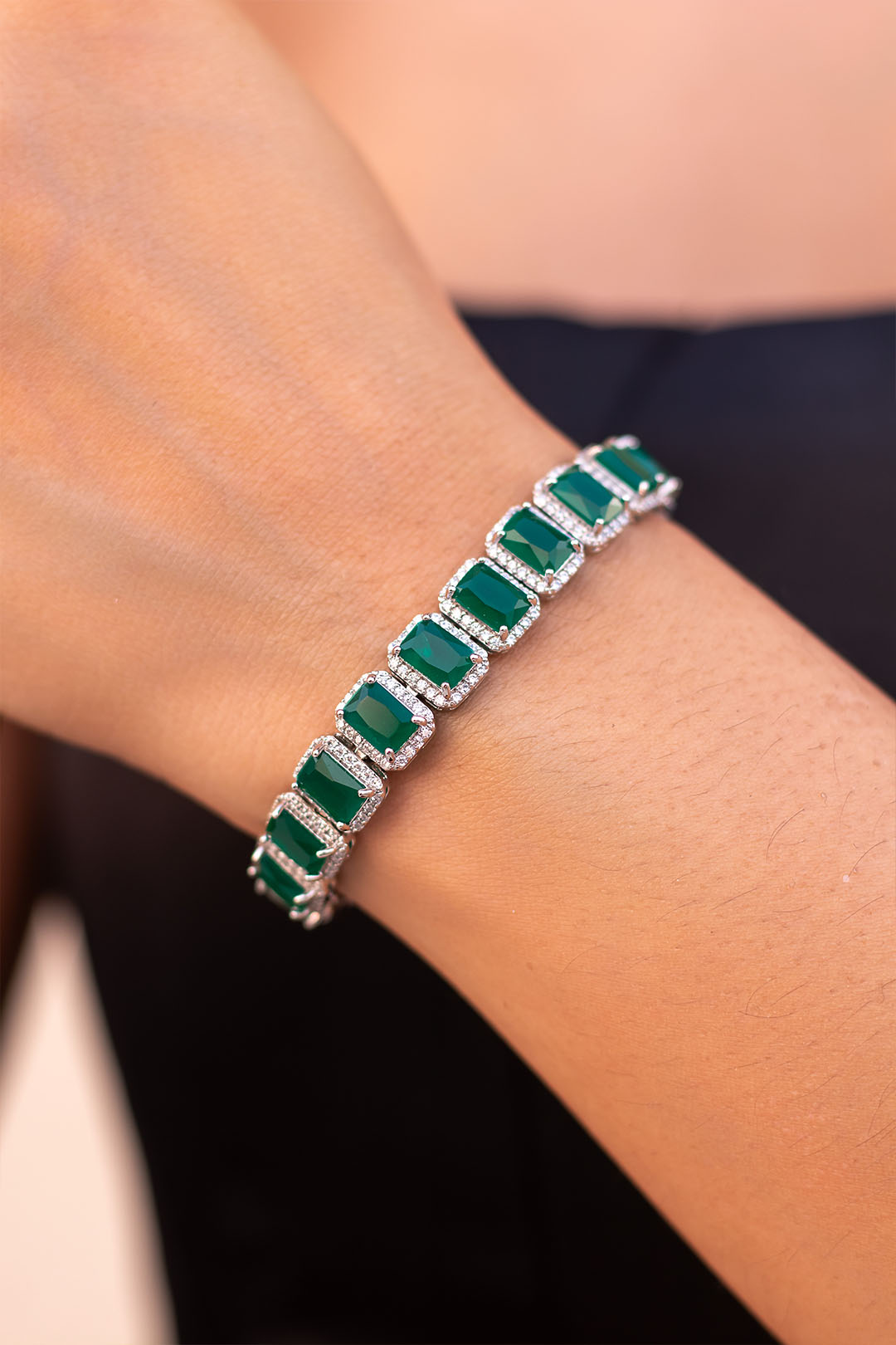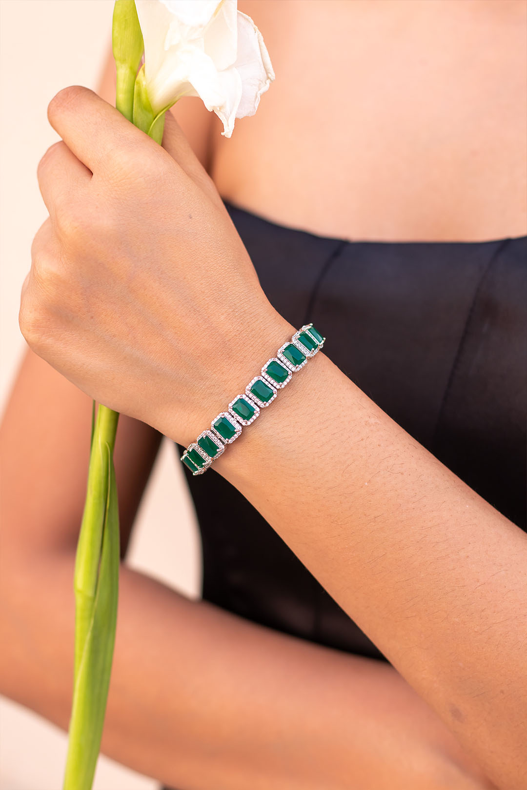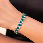 The name Amara, meaning "eternal" and "unfading," perfectly captures the enduring allure of this bracelet. Designed for those who appreciate understated luxury, this exquisite piece features a seamless row of radiant emerald-cut green gemstones, each set within a halo of dazzling pavé diamonds.