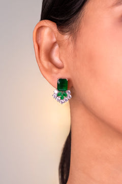 Featuring two emerald-cut green stones flanked by a crystal-clear baguette, this triple-stone ring is framed in pavé brilliance for extra drama. Its adjustable sculptural silhouette and icy silver finish make it the kind of statement that turns heads and starts conversations.