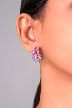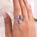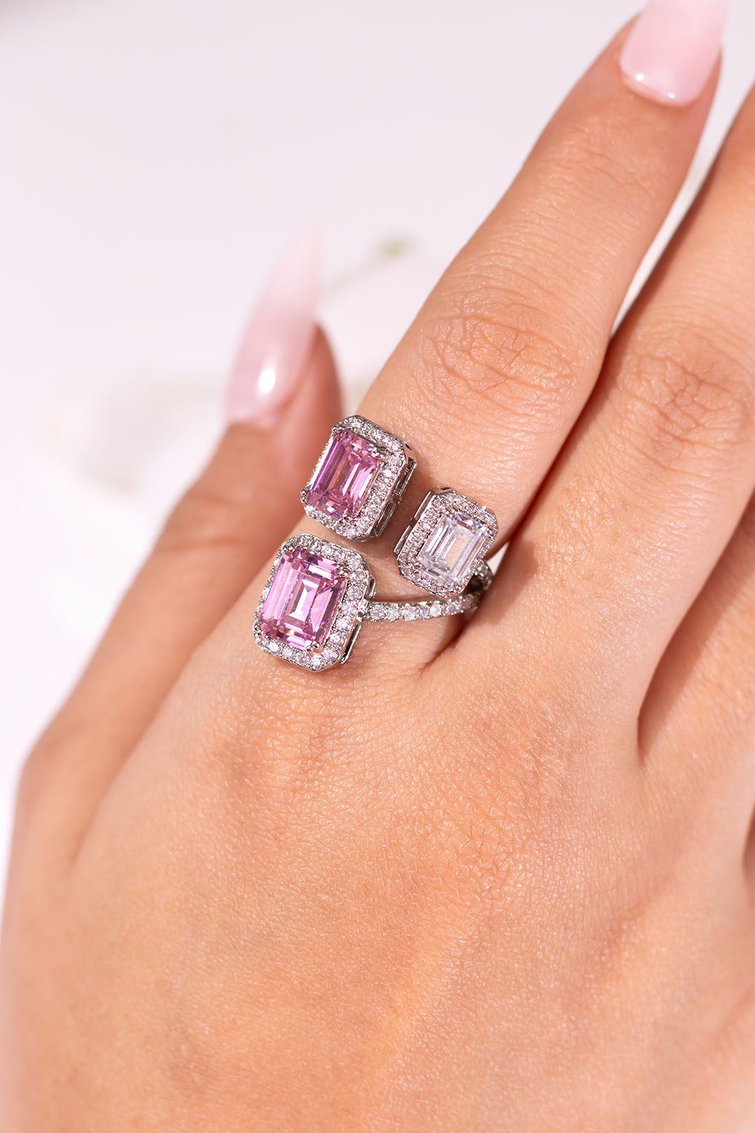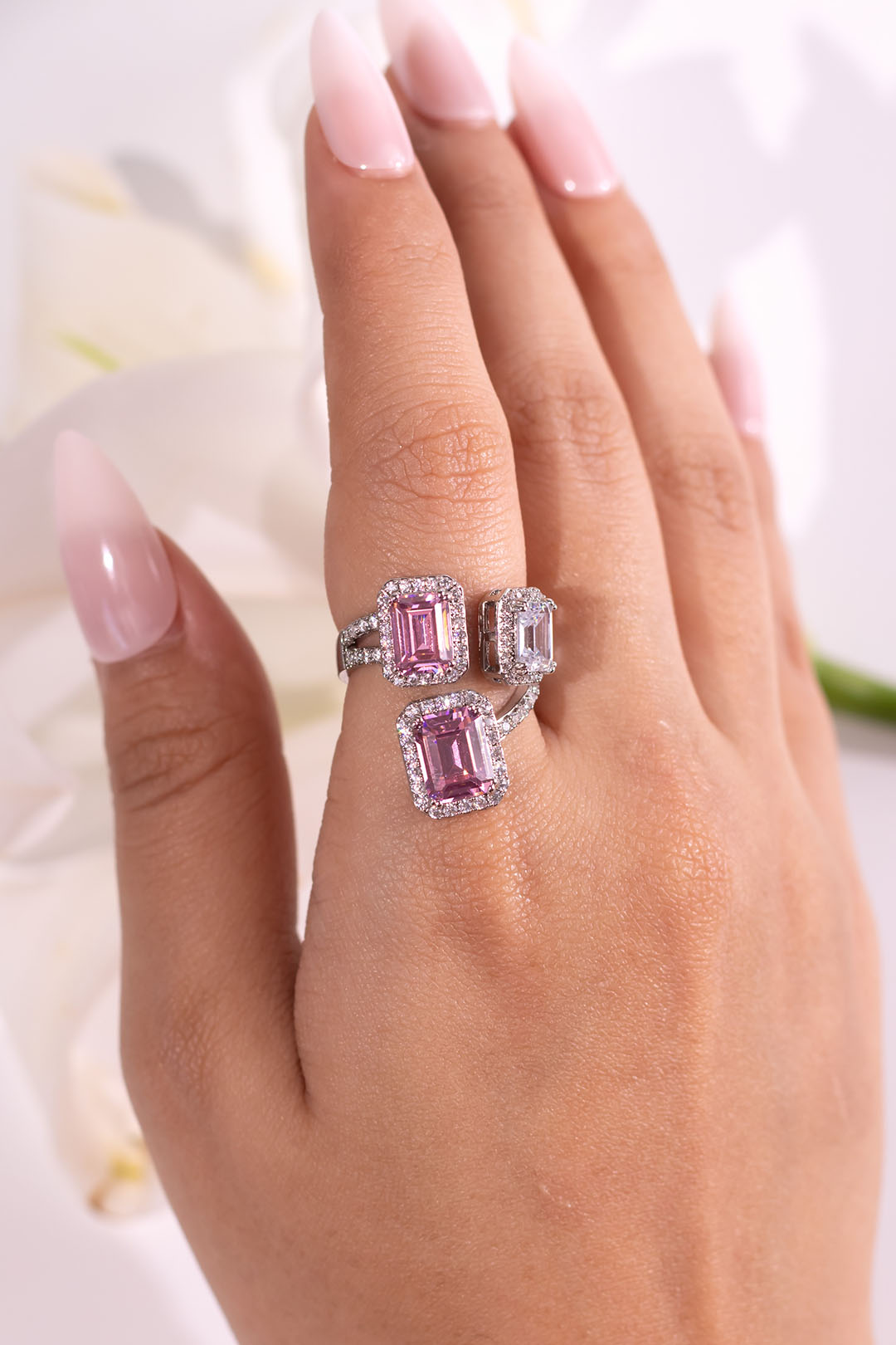 Featuring two emerald-cut pink stones flanked by a crystal-clear baguette, this triple-stone ring is framed in pavé brilliance for extra drama. Its adjustable sculptural silhouette and icy silver finish make it the kind of statement that turns heads and starts conversations.