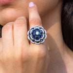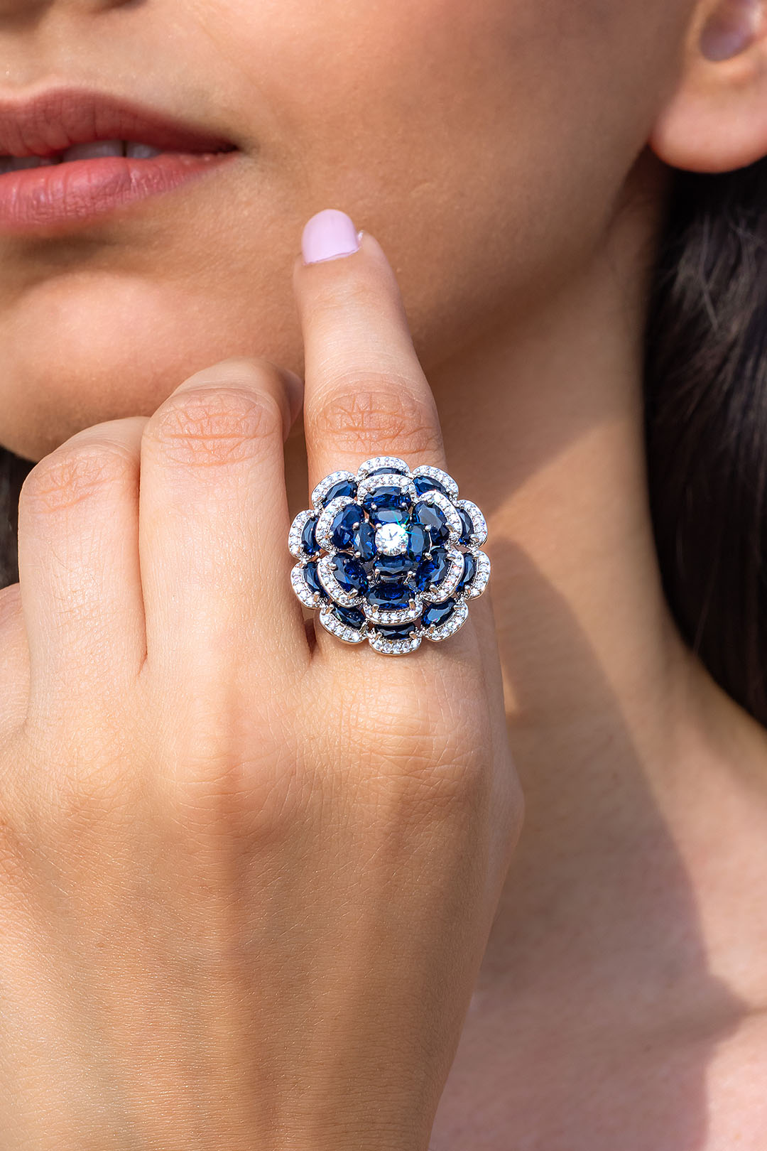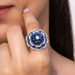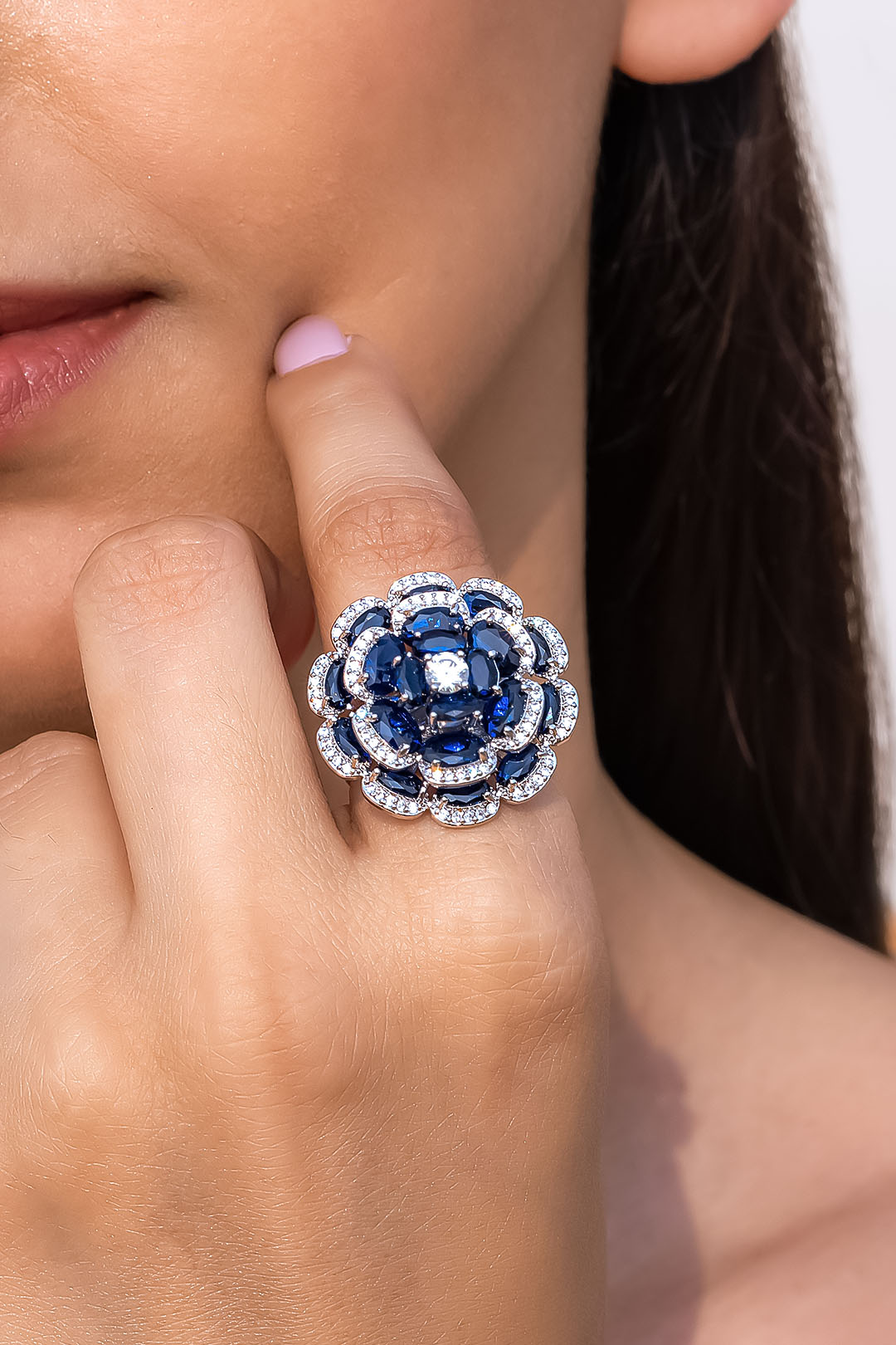 With striking navy-hued crystals framed by layers of sparkling CZ, this handcrafted, fine jewellery like setting this adjustable ring makes a statement of confidence and charm.