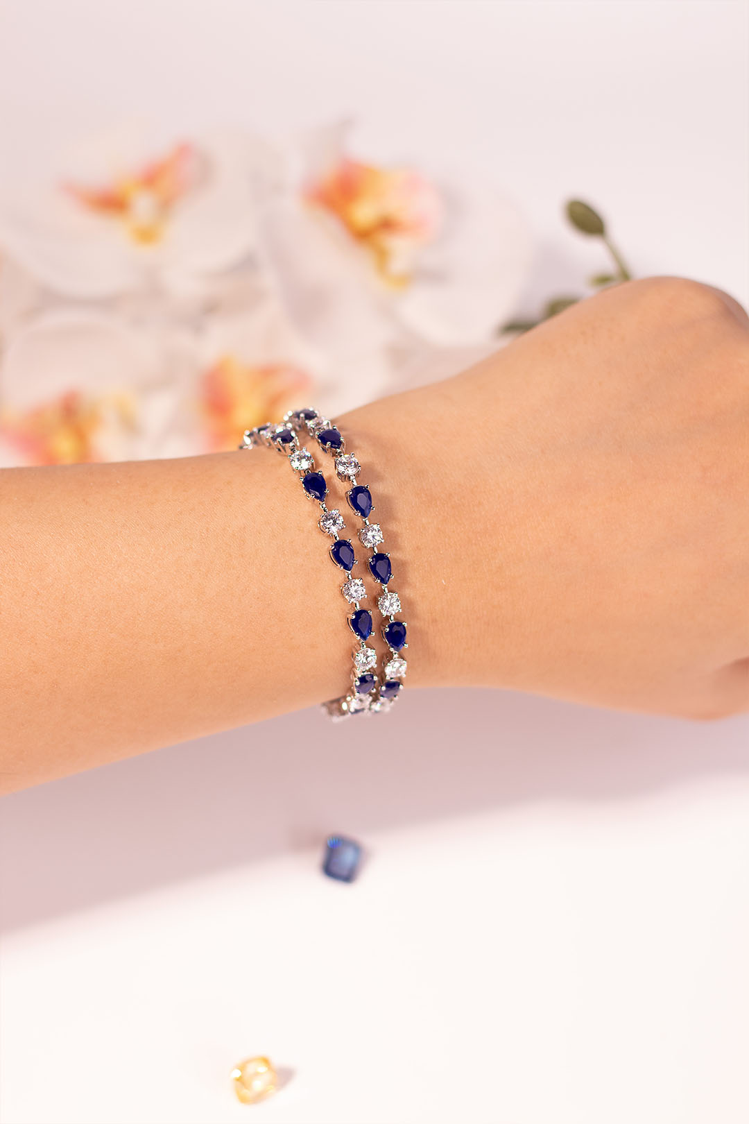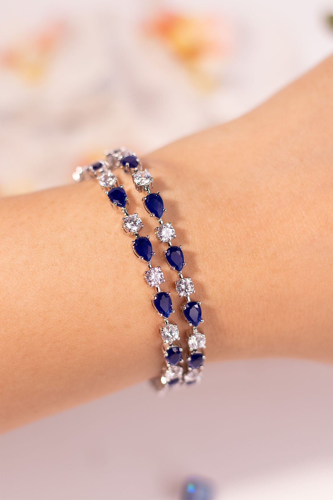 Delicately crafted with pear-cut sapphire blue and brilliant white stones, this bracelet exudes effortless sophistication. Its soft shimmer and versatile palette make it perfect for festive occasions, brunches, or elegant soirées.